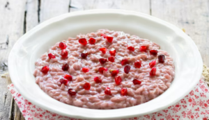 - Scaldate due cucchiai d’olio in una casseruola, lasciatevi appassire la cipolla tritata, unite il riso e mescolate. Quando il riso ha preso colore spruzzatelo con il vino e lasciate evaporare. Versate quindi il succo di melagrana e portate il risotto a cottura come di consueto, aggiungendo un mestolo di brodo caldo alla volta