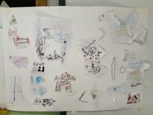 Che cosa può diventare una texture? Durante il percorso di continuità infanzia–primaria, i bambini hanno raccolto tracce dei luoghi della scuola primaria — biblioteca, mensa, giardino — per poi ricordarli e trasformarli. Con strappi, ritagli e una domanda aperta “Cosa può diventare?”, le superfici sono diventate animali fantastici e luoghi immaginari, arricchiti da piccoli particolari e dalle parole dei bambini.